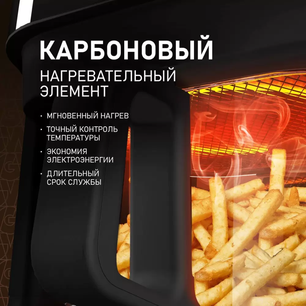 Аэрогриль Weissgauff WAF 515 GB Air Cook Master Аэрогриль от Weissgauff, является инновационным решением для вашей кухни. Этот многофункциональный прибор открывает новые горизонты в кулинарии, объединяя в себе несколько бытовых кухонных приборов. Благодаря современному и стильному дизайну, устройство станет украшением любой кухни, сочетая в себе элегантность и функциональность, компактные размеры, объём 5,5 литров и мощность 1500 Вт позволяют быстро и эффективно создавать огромное количество разнообразных блюд, а также экспериментировать и находить новые кулинарные рецепты. Наслаждайтесь вкусом любимых блюд без лишних калорий, ведь технология обжарки с использованием горячего воздуха сохраняет вкус и питательные свойства продуктов, а простота управления и наличие разнообразных программ превращают готовку в настоящее удовольствие! 7 автоматических программ - Креветки, Стейк, Фри, Крылышки, Рыба, Птица, Разморозка предоставляют вам широкий ассортимент возможностей приготовления вкуснейших блюд! Объем 5,5 литров дает вам полную уверенность в том, что несмотря на компактные размеры этого аэрогриля, вы сможете разместить в нем сразу весь необходимый объем пищи, порадовав себя и своих близких изысканными блюдами, приготовленными на действительно ресторанном уровне. Мощность 1500 Вт - позволяет легко и быстро приготовить разнообразные блюда для всей семьи и обеспечивает оптимальный баланс между скоростью приготовления блюд и объёмом потребления электроэнергии. Ручной режим - предоставляет возможность самостоятельно устанавливать время и температуру приготовления. Это делает прибор универсальным и подходящим для создания разнообразных блюд, а также позволяет экспериментировать и открывать новые горизонты в кулинарии. Циркуляция воздуха 360° - позволяет горячему воздуху распределяться по всей камере прибора одинаково, благодаря этому продукты не пригорают и готовятся равномерно, сохраняя все соки, вкус и добиться вкусной хрустящей корочки, при этом не используя масло. Технология OilFree, позволяет готовить без добавления масла. Внутри рабочей камеры непрерывно циркулируют горячие потоки воздуха, которые так быстро и равномерно пропекают продукты, что внутри они получаются сочными и нежными, а снаружи покрываются золотистой хрустящей корочкой. Приготовленные блюда при помощи данной технологии сохраняют свой яркий вкус, аромат и полезные свойства! Карбоновый нагревательный элемент обеспечивает быстрый и равномерный нагрев продуктов, что способствует эффективному и качественному приготовлению блюд. Таймер с автоотключением будет особенно удобен в случае, если вы хотите запрограммировать работу аэрогриля на требуемый промежуток времени с последующим автоматическим завершением нагрева! Полностью электронное сенсорное управление интуитивно понятное даже человеку, никогда ранее не работавшему с подобной техникой, сделает процесс запуска аэрогриля быстрым и лёгким! Функция автоотключения при снятии чаши во время работы переводит устройство в режим паузы, выключая вентилятор и нагревательные элементы. При возвращении чаши приготовление автоматически продолжится - это защитит вас и ваших детей при незапланированном снятии чаши. Стеклянная чаша в аэрогриле позволит вам наблюдать за процессом приготовления не вытаскивая чашу и то