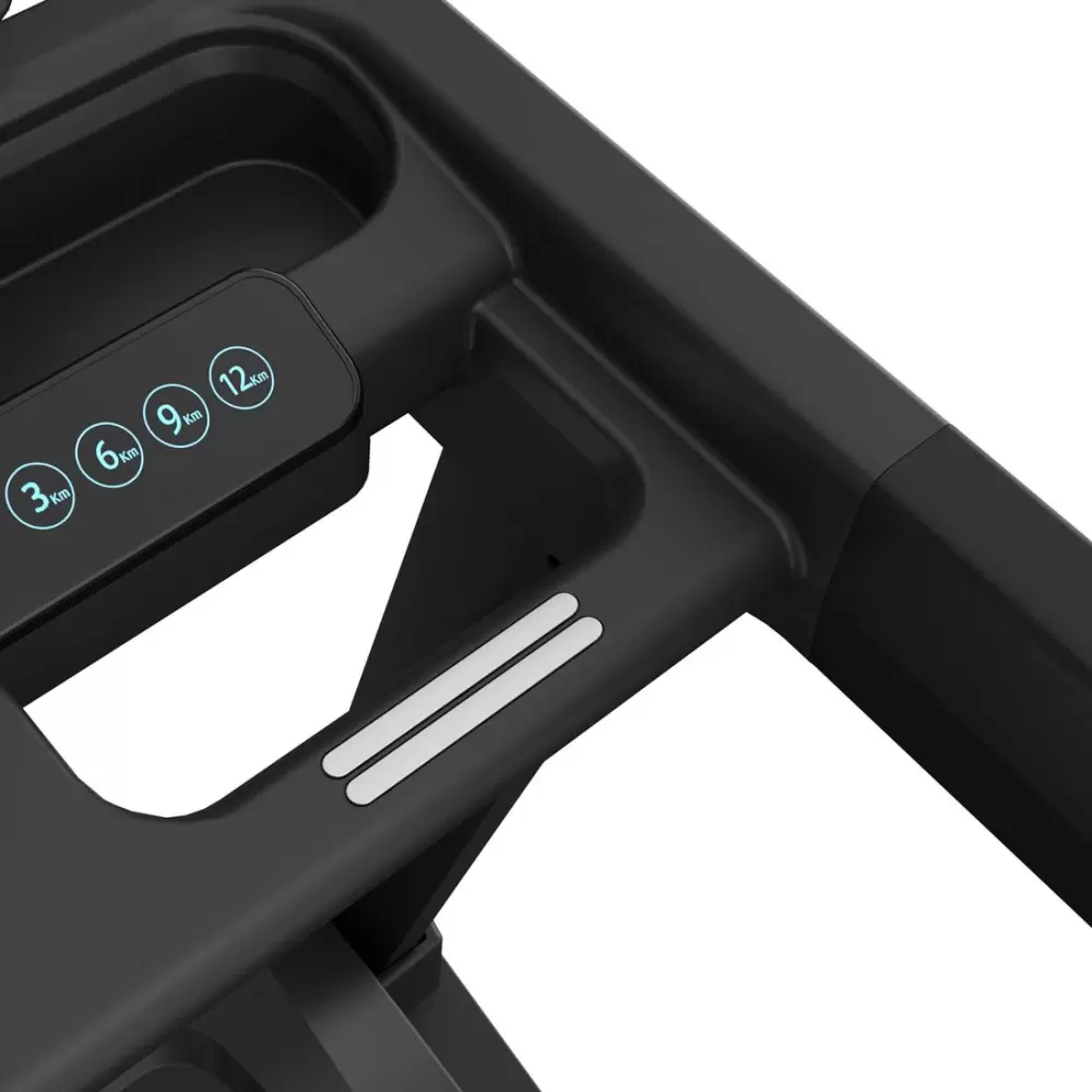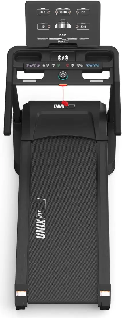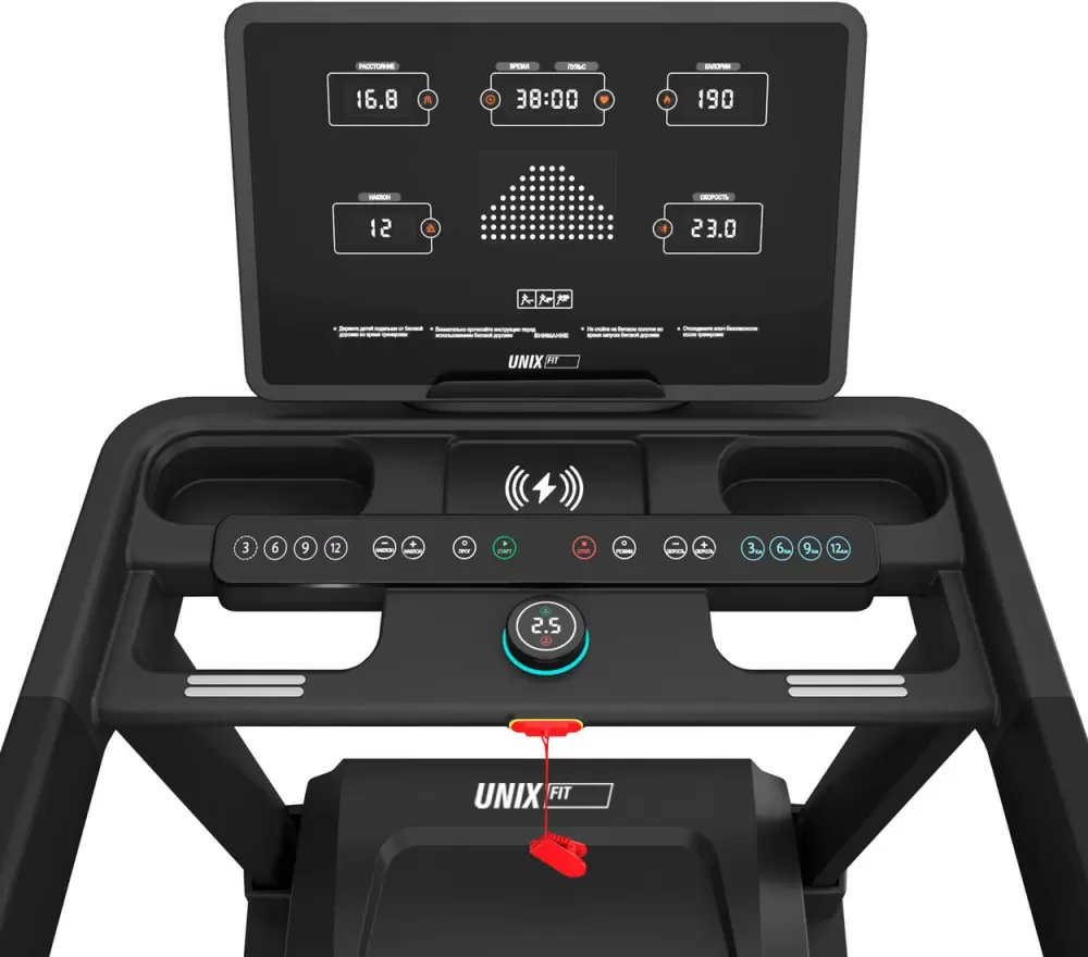 UNIX Fit MX-970 — инновационная электрическая беговая дорожка премиум-класса для дома с функцией беспроводной зарядки, созданная для пользователей, которые ценят эффективность тренировок, высокий уровень комфорта и современные технологии. Универсальность модели делает ее отличным выбором как для новичков, так и для опытных спортсменов. Особенности конструкции Складная конструкция беговой дорожки обеспечивает компактное хранение и быстрое раскладывание, позволяя экономить пространство в квартире или доме. Кардиотренажер легко вписывается даже в ограниченные помещения, сохраняя при этом полноценную зону для бега и ходьбы. Для удобства перемещения предусмотрены четыре транспортировочных ролика, благодаря которым дорожку можно без усилий передвигать внутри помещения. Это делает домашние тренировки комфортными для всех членов семьи. Мощный двигатель постоянного тока Беговая дорожка оснащена надежным DC-двигателем с пиковой мощностью 6 л.с., позволяющим развивать скорость до 22 км/ч. Воздушная система охлаждения эффективно защищает мотор от перегрева и продлевает срок его службы. Низкий уровень шума и минимальные вибрации обеспечивают комфортные занятия в домашних условиях в любое время суток. Эффективные тренировки Кардиотренажер предлагает 24 встроенные программы тренировок и 3 пользовательских режима, что позволяет подобрать оптимальную нагрузку под индивидуальные цели. Одним из ключевых преимуществ модели является автоматическая регулировка угла наклона с 20 уровнями, которая имитирует подъемы и спуски разной сложности. Такие возможности значительно повышают интенсивность тренировок, делают их более разнообразными и помогают быстрее добиться результатов — похудеть, улучшить выносливость и укрепить мышцы ног, бедер и ягодиц. Современные технологии Домашняя беговая дорожка UNIX Fit MX-970 поддерживает синхронизацию с приложением FitShow по Bluetooth. Управление параметрами тренировки возможно прямо со смартфона: выбор программ, анализ статистики, отслеживание прогресса и участие в онлайн-соревнованиях с друзьями. Дополнительный комфорт обеспечивают встроенные динамики, позволяющие воспроизводить музыку во время занятий. Забота о комфорте Широкая беговая зона размером 150 × 54 см обеспечивает комфортные условия для тренировок даже высоким пользователям. Максимальный вес пользователя составляет 180 кг, что подтверждает надежность и прочность конструкции. Износостойкое беговое полотно обладает антистатическим эффектом, предотвращающим накопление статического электричества. Прочная дека толщиной 18 мм и система амортизации из 8 эластомеров эффективно снижают ударную нагрузку на суставы и позвоночник. Для дополнительной безопасности модель оснащена ключом аварийной остановки, а встроенная функция беспроводной зарядки позволяет подзаряжать мобильные устройства прямо во время тренировки. Мониторинг показателей и функциональность 6 LED-дисплеев отображают все ключевые параметры тренировки: время скорость дистанцию сожженные калории угол наклона индекс массы тела (ИМТ) частоту пульса Инновационная кнопка-диммер обеспечивает быстрое и удобное переключение режимов отображения информации. Панель управления оснащена кнопками быстрого доступа для изменения скорости, угла наклона, выбора программ и управления старт