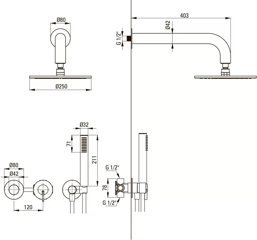 душевая система (с верхним душем), скрытый монтаж, механический смеситель, верхний душ 250 мм, ручной душ 32 мм