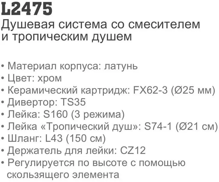 Информация о характеристиках, комплекте поставки и внешнем виде товара является справочной и получена из открытых источников (официальные сайты и каталоги производителей). Перед покупкой уточняйте у продавца интересующие Вас параметры и актуальную цену на Душевая система Ledeme L2475.
