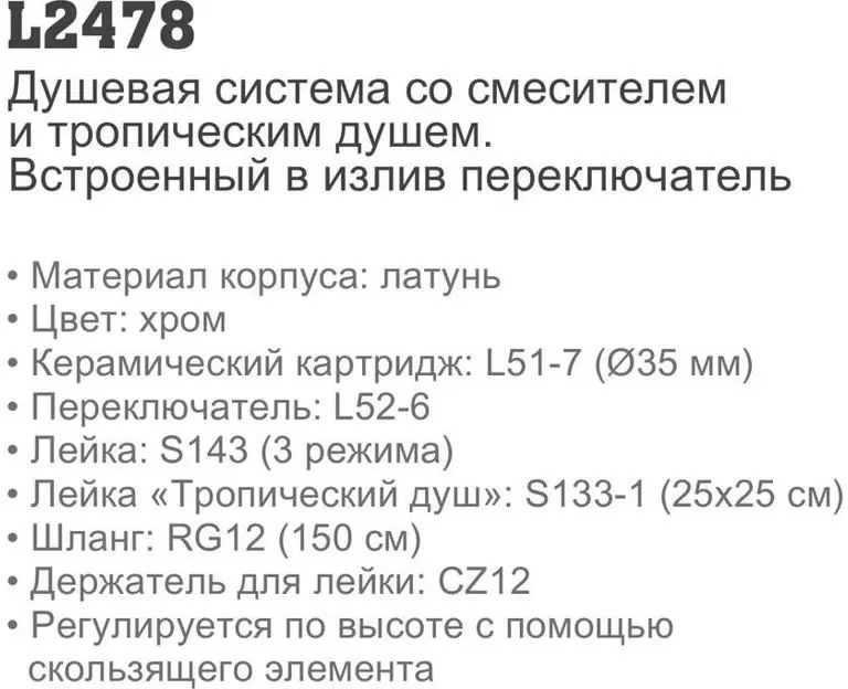 Информация о характеристиках, комплекте поставки и внешнем виде товара является справочной и получена из открытых источников (официальные сайты и каталоги производителей). Перед покупкой уточняйте у продавца интересующие Вас параметры и актуальную цену на Душевая система Ledeme L2478.