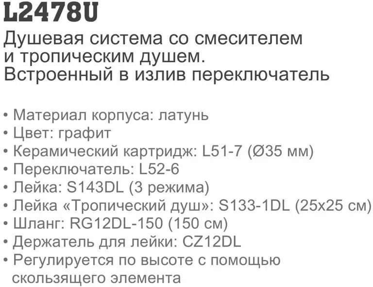 Информация о характеристиках, комплекте поставки и внешнем виде товара является справочной и получена из открытых источников (официальные сайты и каталоги производителей). Перед покупкой уточняйте у продавца интересующие Вас параметры и актуальную цену на Душевая система Ledeme L2478D.