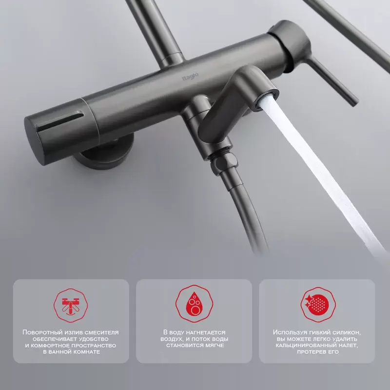 Душевая система с верхним тропическим душем в цвете хром. Настенная душевая система с изливом — продукция высокого качества. Сочетает в себе удобную конструкцию, простоту установки, универсальный современный дизайн. Прекрасно дополнит интерьер любой ванной комнаты. Излив поворотный. Переключатель в изливе. Данная модель позволяет легко регулировать температуру и напор воды с помощью однорычажного управления. Аэратор обеспечивает равномерную подачу воды и ее смягчение. Сетка в устройстве отфильтровывает нежелательные примеси. Душевая система выполнена в модном современном оформлении, необычная модель в дизайнерском исполнении. К данной группе изделий относится традиционный тип приборов, изготовленных из латуни — долговечного, прочного, надежного материала. Форма изделия округлая. Благодаря своей простоте и проверенной надёжности эти модели очень популярны в настоящее время.Основные ХарактеристикиТип : душевая система со смесителемНазначение : для душаМонтаж : настенныйМатериал панели/стойки : латуньКоллекция : R20 (Raglo)Цвет : графитНазвание расцветки : графитВ комплекте : верхний душ, лейка ручная, душевой шланг, штанга, отражатели (2 шт.), эксцентрики (2 шт.)Смеситель в комплекте : механическийМатериал ручного душа : пластикФорма ручного душа : кругРежимы ручного душа : 3Смена режимов ручного душа : вращающийся дискРегулировка держателя ручного душа : высотаМатериал верхнего душа : металлФорма верхнего душа : кругРегулировки верхнего душа : поворот кронштейнаРежимы верхнего душа : 3Режим "Тропический дождь" : естьМатериал держателя : ABS пластикМатериал шланга : латуньВысота панели/стойки : от 113 до 148 смШирина/диаметр верхней лейки : 25 смВылет верхнего душа : 37 смДлина шланга : 150 смВес : 1.349 кг (смеситель)
