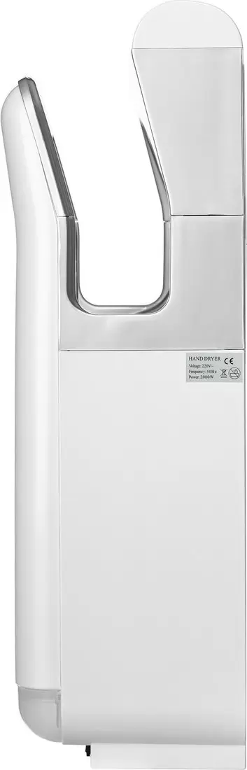 Сушилка для рук. Мощность: 2000 Вт. Скорость воздушного потока: 16 м/с. Влагозащита: IPX1. Защита от перегрева. Максимальная температура воздуха: 53 °C. Время сушки: 20 с.