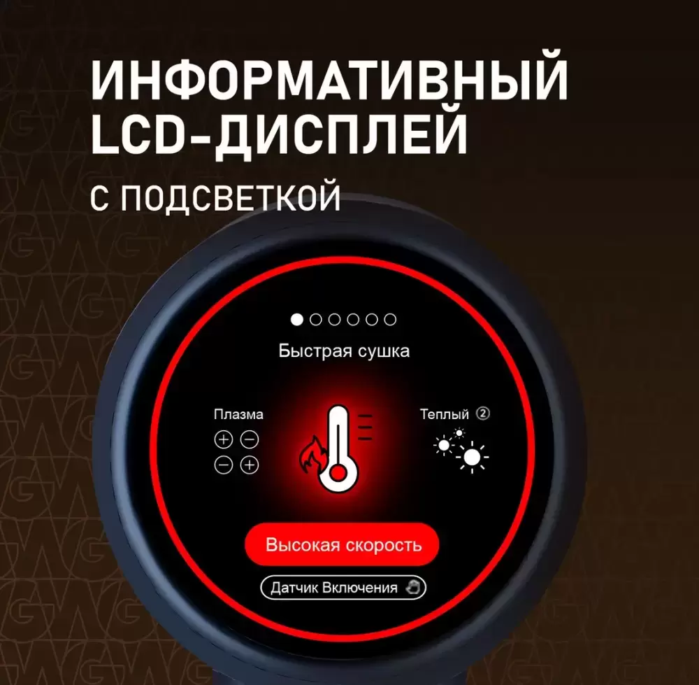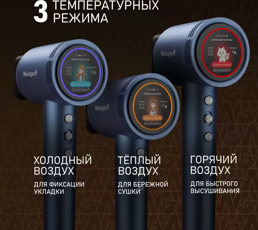 Weissgauff представляет вашему вниманию профессиональный фен WHD 161 BLDC Infrared Plasma Care для волос оснащен высокоэффективным инверторным мотором по технологии BLDC, имеющий мощность 1600 Вт, 6 автоматических режимов, большой информативный LCD дисплей, ионизацию. А комплект из 4 дополнительных насадок лишь расширит возможности этого великолепного устройства! Мощность 1600 Вт - обеспечивает хороший баланс между эффективностью и бережным воздействием, что делает данную модель подходящую для большинства типов волос. Инверторный мотор - созданный по особой технологии BLDC, использующей электромагнитное поле для вращения двигателя, что значительно снижает уровень шума, износа и энергопотребления, продлевая срок службы вашего устройства! Скорость вращения двигателя 110000 об/мин - это высокоскоростной бесщеточный фен, который обеспечивает невероятно мощный и быстрый поток воздуха, что значительно сокращает время сушки волос, делает процесс более эффективным и быстрым. 1 миллиард плазма-ионов, циркулируя в потоке воздуха, разбивают молекулы воды на мельчайшие кластеры, глубоко увлажняют волосы и снимают статическое электричество, обеспечивая идеальный результат! 6 автоматических режимов работы: Короткие волосы, Длинные волосы, Питомцы, Детский, Быстрая сушка, AI – умный режим. Широкие возможности благодаря 4 насадкам: концентратор, диффузор, насадка для укладки, насадка-расческа. Режим Инфракрасный уход за кожей головы - это инновационный режим, который использует мягкое инфракрасное тепло для улучшения кровообращения, питания волосяных фолликул и стимуляции роста волос, работая быстрее и бережнее, чем обычные фены. Ионизация - с помощью данной функции фен генерирует отрицательно заряженные ионы, которые разбивают воду на микрочастицы, ускоряя сушку, и нейтрализует статическое электричество, делая волосы более гладкими, блестящими, послушными и уменьшая пушистость, а также помогая сохранить естественную влагу, предотвращая пересушивание и повреждение кутикулы. Низкий уровень шума 59 дБ сделает работу по-настоящему комфортной и приятной, ведь мы в Weissgauff знаем, как добиться высокой производительности без лишнего шума! Большой информативный LCD дисплей - позволит точно контролировать режимы работы, благодаря чему достигаются профессиональные результаты. Автоотключение в горизонтальном положении - Эта технология реагирует на изменение положения корпуса, что позволяет вам временно отвлечься, не выключая фен вручную, и делает его безопаснее для домашнего использования.