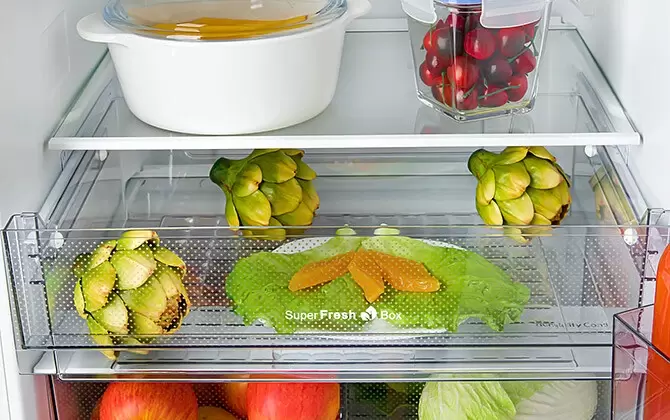ECO режим; Антибактериальное покрытие; Защита от детей; Индикация температуры; Независимая регулировка температуры; Охлаждение напитков; Регулировка влажности; Режим «Отпуск»; Суперзаморозка (SuperFrost); Суперохлаждение (SuperCool) |