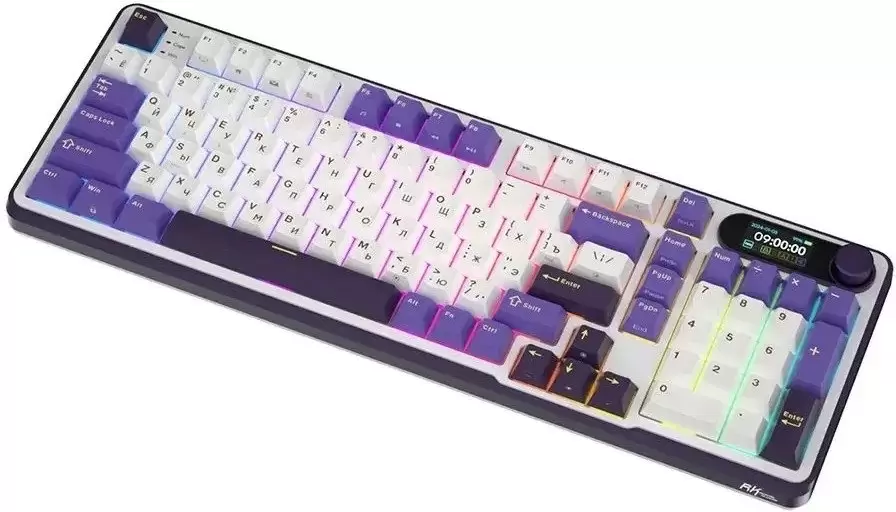 игровая для ПК, механическая, RK Brown, ход тактильный/с кликом, пластик, интерфейс подключения - USB-A/радио/Bluetooth/USB-C, кириллица: да, USB-хаб, цвет белый/темно-синий/фиолетовый