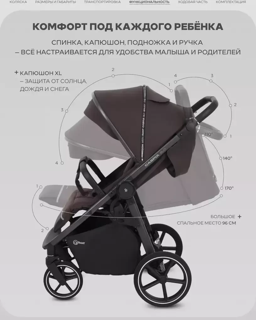 Регулируемая по высоте ручка (4 положения); Регулируемый наклон спинки; Регулируемая подножка (2 положения); Регулируемый капюшон (4 положения) |