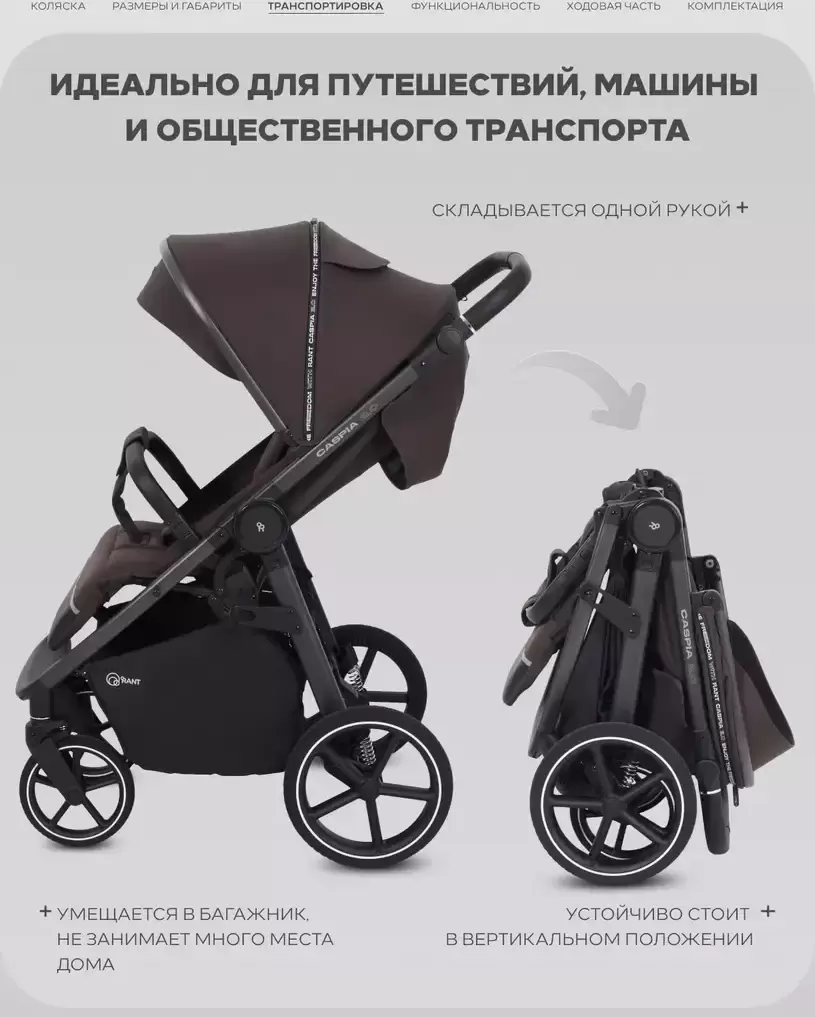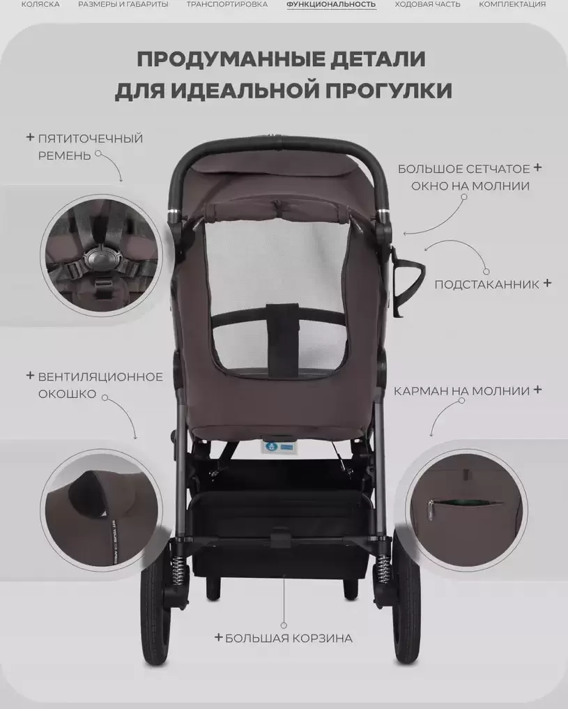 Держатель для бутылочки; Дождевик; Карман для мелочей; Нижняя корзина; Окошко в капюшоне; Противомоскитная сетка; Светоотражающие нашивки; Сетчатые вставки; Чехол на ноги |