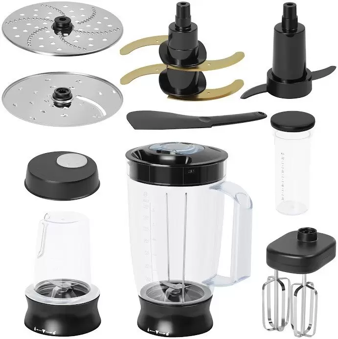 Блендер; Венчики для взбивания; Диски для шинковки; Мельничка; Нарезка ломтиками; Насадка для смешивания; Насадка для теста; Тёрка; Тёрка для драников |