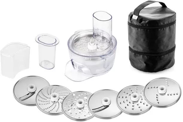 Блендер; Венчики для взбивания; Диски для шинковки; Мельничка; Насадка для смешивания; Насадка для теста; Соковыжималка; Тёрка; Шнековая мясорубка |