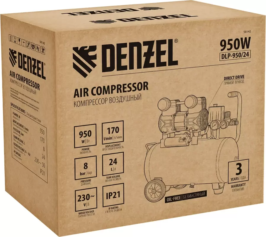Код: 24214826 поршневой, безмасляный, ресивер: 24 л Общая информация Информация Безмасляный малошумный компрессор Denzel DLP-950/24 58142 мощностью 950 Вт и производительностью 170 л/мин, с ресивером объемом 24 л, оснащен двигателем со скоростью вращения 2850 об/мин. Предназначен для обеспечения пневмоинструмента сжатым воздухом. Для работы компрессора не требуется масло, поэтому он подходит для проведения покрасочных работ и продувки электронных компонентов. Прямой привод обеспечивает максимально эффективную работу и высокую производительность. Благодаря низкому уровню шума эксплуатация компрессора не вызывает ощущение дискомфорта.###BR###Преимущества###BR######BR### Автономность — специальное реле останавливает компрессор по достижении максимального рабочего давления и запускает двигатель при падении давления до минимального уровня.###BR### Безопасность — в случае превышения максимального давления в ресивере срабатывает предохранительный клапан, что позволяет избежать аварийных ситуаций.###BR### Удобный контроль работы — компрессор оснащен 2 манометрами для отслеживания давления в ресивере и пневмолинии###BR### Термозащита — двигатель отключается при превышении критической температуры обмоток для предотвращения их оплавления.###BR### Защита по току — в случае перегрузки двигатель останавливается, что защищает его от поломки.###BR### Регулировка давления — можно установить необходимый уровень в зависимости от подключаемого инструмента.###BR### Простое присоединение — благодаря быстросъемному коннектору подключение пневмоинструмента не занимает много времени.###BR### Дополнительные возможности — специальный порт позволяет при необходимости присоединить пневмолинию или еще один ресивер напрямую к накопителю, это дает возможность забора воздуха из ресивера без потерь.###BR### Снижение уровня вибраций — виброопора гасит колебания, возникающие во время работы.###BR### Мобильность — 2 колеса и транспортировочная рукоятка упрощают перемещение компрессора по рабочей зоне. Описание Основные Тип поршневой Тип двигателя электрический Тип смазки безмасляный Привод прямой Ресивер Да 24 л Цвет желтый Технические характеристики Осушитель Нет Мощность 0.95 кВт Производительность на входе 170 л/мин Входное напряжение 230 В Максимальное давление 5.5 — 8 атм Количество цилиндров 2 Уровень шума 70 дБ Конструкция Передвижной Да Портативный Нет Комплектация - Компрессор;###BR###- Колесо с крепежом;###BR###- Виброопора с крепежом;###BR###- Воздушный фильтр;###BR###- Инструкция по эксплуатации с гарантийным талоном. Размеры и вес Длина 580 мм (в упаковке) Ширина 270 мм (в упаковке) Высота 560 мм (в упаковке) Вес 21 кг (в упаковке) Изображение товара и комплектация могут отличаться. Смотреть Полное описание: