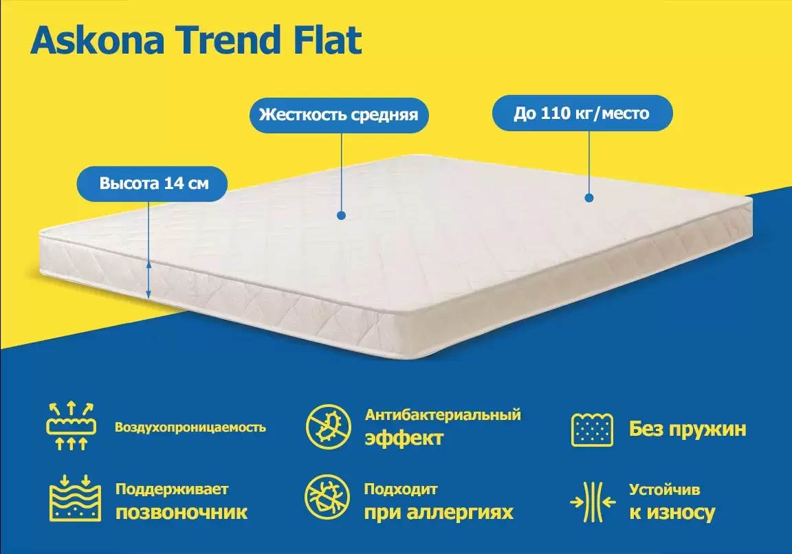 Информация о характеристиках, комплекте поставки и внешнем виде товара является справочной и получена из открытых источников (официальные сайты и каталоги производителей). Перед покупкой уточняйте у продавца интересующие Вас параметры и актуальную цену на Матрас Askona Trend Flat 90x186.