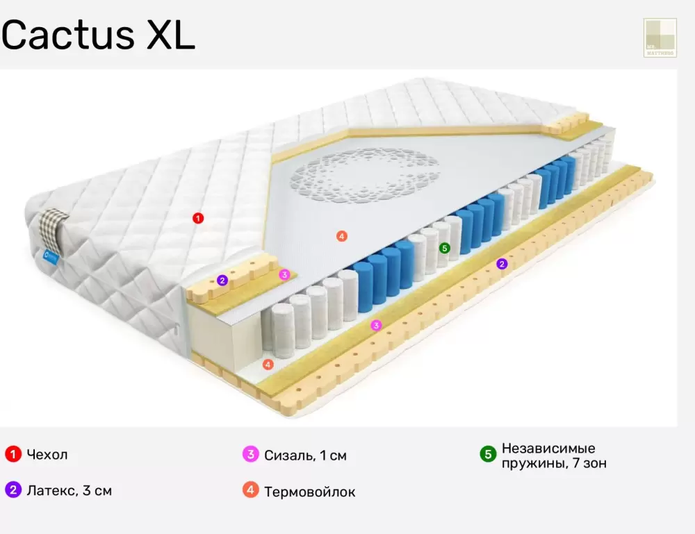 Информация о характеристиках, комплекте поставки и внешнем виде товара является справочной и получена из открытых источников (официальные сайты и каталоги производителей). Перед покупкой уточняйте у продавца интересующие Вас параметры и актуальную цену на Матрас Mr. Mattress Cactus XL 200x190.