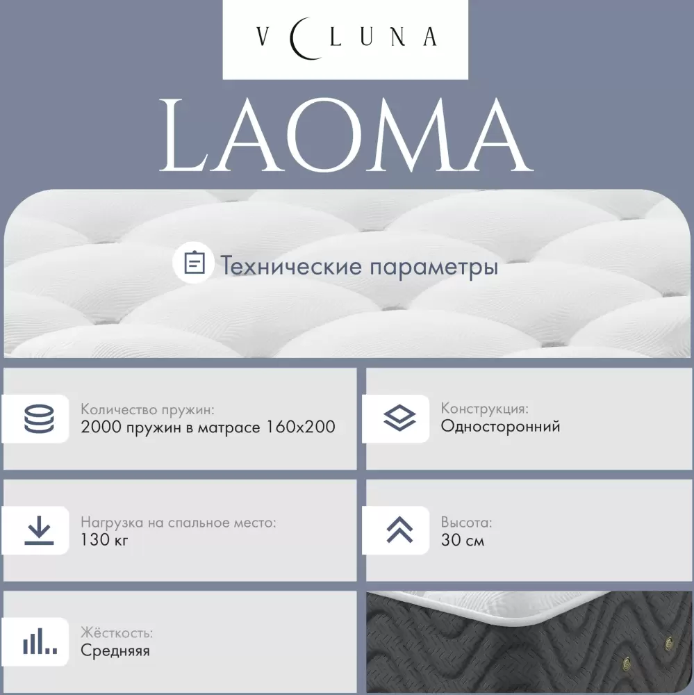 Информация о характеристиках, комплекте поставки и внешнем виде товара является справочной и получена из открытых источников (официальные сайты и каталоги производителей). Перед покупкой уточняйте у продавца интересующие Вас параметры и актуальную цену на Матрас VELUNA Laoma 120x190x30.