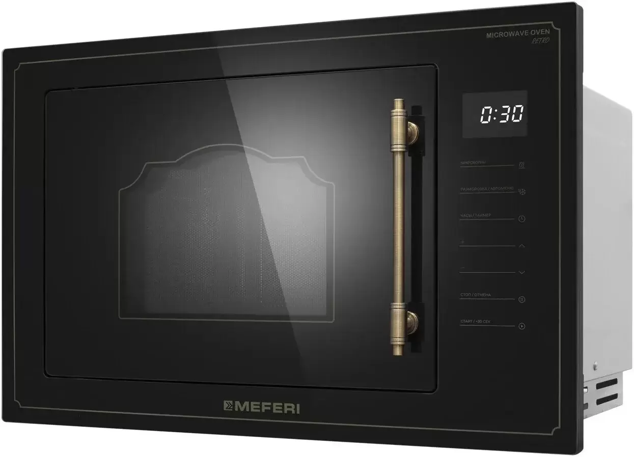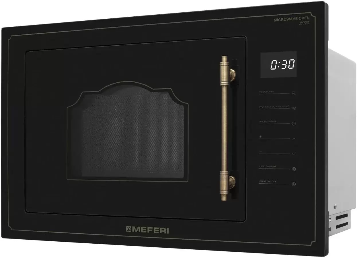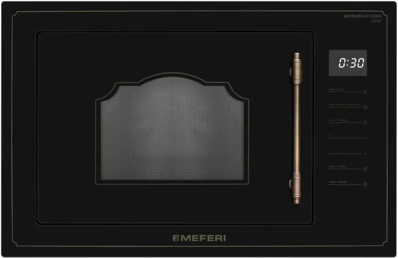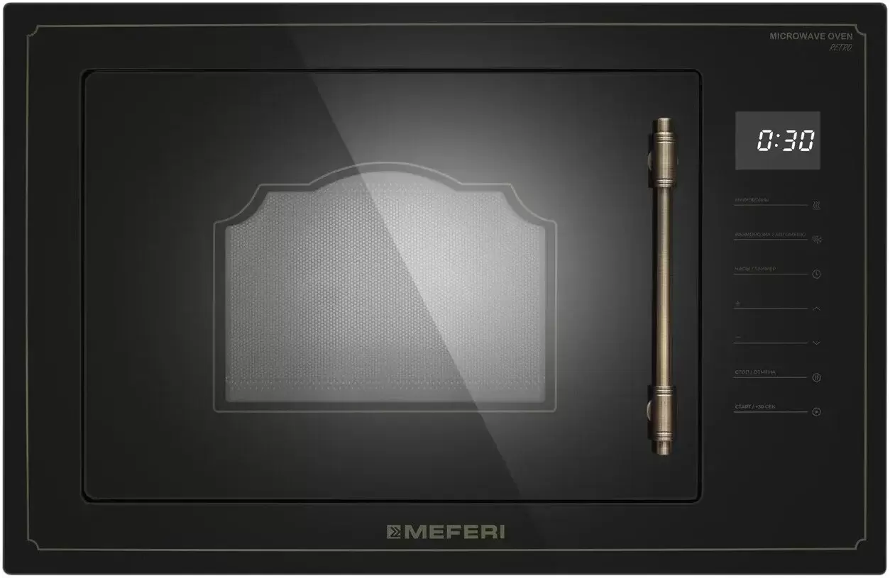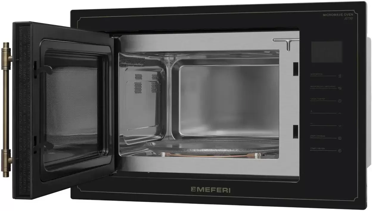 MEFERI MMO6025BK RETRO — микроволновка в чёрном ретро‑стиле, которая становится выразительным акцентом на кухне и гармонично дополняет другую технику MEFERI Она помогает быстро разогревать, аккуратно размораживать и готовить блюда в повседневном режиме, оставаясь удобной и понятной в использовании. Основные преимущества: Объём 25 л. Делает микроволновку удобной для ежедневного разогрева и приготовления блюд для всей семьи. Габариты 595 × 370 × 386 мм. Позволяют аккуратно встроить модель в кухонный гарнитур и сохранить рабочее пространство на столешнице. Сенсорное управление с дисплеем. Помогает легко выбирать программы, настраивать мощность и время и контролировать процесс приготовления. Входная мощность 1450 Вт и 5 уровней мощности микроволн. Обеспечивают гибкость — от мягкого подогрева до интенсивного разогрева и готовки. Восемь программ автоменю с настройкой по весу. Берут на себя подбор параметров, поэтому популярные блюда удобно готовить одним прикосновением. Режимы разогрева и разморозки по времени и по весу. Помогают бережно подготавливать продукты, сохраняя их текстуру и сочность. Таймер с автоотключением на 95 минут и кнопка быстрого старта на 30 секунд. Упрощают использование микроволновой печи в повседневной спешке. Поворотный стол диаметром 315 мм. Обеспечивает равномерный прогрев и позволяет использовать посуду большого размера. Внутреннее покрытие из нержавеющей стали. Отличается долговечностью и упрощает уход, а галогеновое освещение даёт хороший обзор блюда во время приготовления. Блокировка панели управления (защита от детей). Повышает безопасность эксплуатации техники в семье. Чёрный ретро‑дизайн фасада. Позволяет сочетать микроволновку с духовым шкафом MEO606BK RETRO и создавать на кухне единый, гармоничный комплект техники (артикул комплекта: MS60BK77). MEFERI MMO6025BK RETRO помогает быстро и удобно разогревать, размораживать и готовить блюда, а ретро‑дизайн в чёрном цвете добавляет кухне индивидуальность и подчёркивает стиль интерьера.