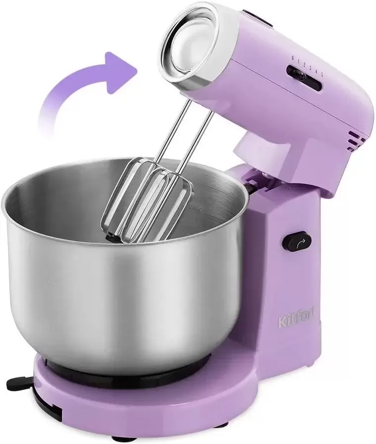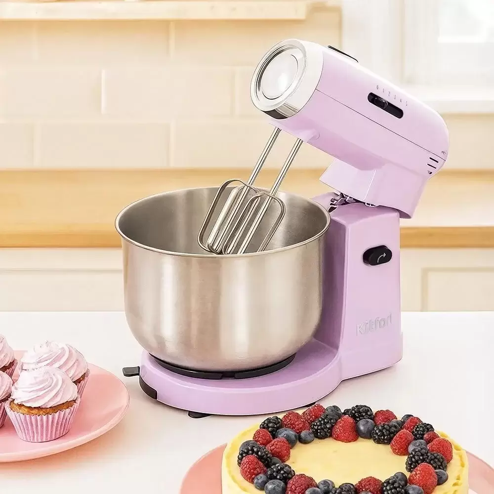 Код товара: 4066726. Фирменный ПОДАРОК при заказе через корзину сайта!стоимость товара на сайте указана с учетом скидки.информация о наличии и сроках доставки носит справочный характер.точную информацию уточняйте у менеджера. Общая информация Страна производства: Китай Основные Тип: стационарный Питание: от сети Мощность: 300 Вт Число скоростей: 5 Объем чаши: 3.2 л Материал чаши: металл Цвет: фиолетовый Технические характеристики Турборежим: Нет Импульсный режим: Нет Вращение чаши: Да Материал корпуса: пластик Кнопка отсоединения насадок: Да Длина сетевого шнура: 1.1 м Комплектация Универсальный измельчитель: Нет Мерный стакан: Нет Насадка для теста: Да 2 Насадка-венчик: Да 2 Насадка для приготовления пюре: Нет Насадка-блендер: Нет Вакуумный насос: Нет Приспособление для хранения насадок: Нет Защитная крышка на чашу: Нет