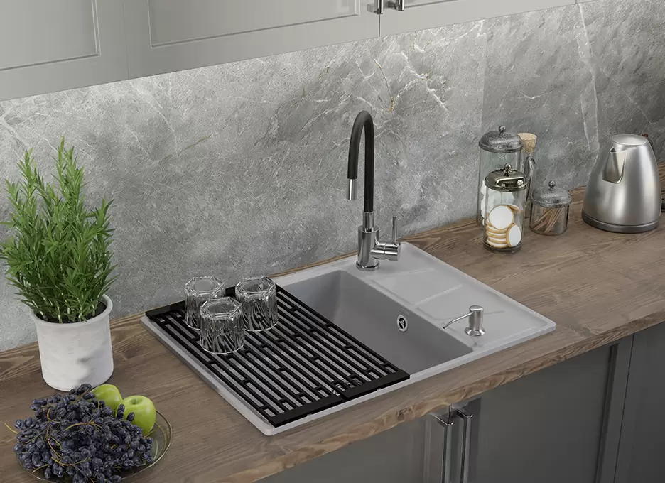 Рассматривали именно этого производителя, потому что наслышаны от кухонщиков, что они очень хорошего качества. Мойка действительно очень достойная, нравится ее цвет, она вроде и матовая, но есть легкий блеск. Хорошо моется, не царапается. Удобный сифон, хозяйки оценят. Ролл-мат использую не так часто, но он удобный.