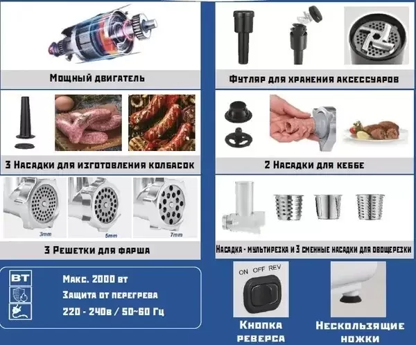 Код товара: 4132188. Все товары указаны со скидкой. Оперативная доставка по Минску и РБ. У нас только оригинальная продукция по низким ценам. Гарантия в официальном сервисном центре. Возможность рассрочки уточняйте у оператора! Не является публичной офертой. Страна производства: Китай Мощность: 450 Вт Максимальная мощность при блокировке вала: 2 000 Вт Реверс: Да Материал корпуса: пластик Цвет: белый, серебристый Насадки и аксессуары внутри корпуса: Да Длина: 515 мм Ширина: 185 мм Высота: 230 мм Вес: 3600 г Формовочные диски: 3 Насадка Кеббе: Да Насадка для домашней колбасы: Да Соковыжималка универсальная: Нет Соковыжималка для цитрусовых: Нет Ломтерезка: Да Тёрки: Да 2 Кофемолка: Нет Дополнительные насадки: Нет Полная комплектация: мясорубка, загрузочный лоток, нож, толкатель, фиксирующая гайка, шнек, формовочные диски (3 шт.), насадки для кеббе (2 шт.), насадки для домашней колбасы (3 шт.), терки (2 шт.), насадка для шинковки, инструкция
