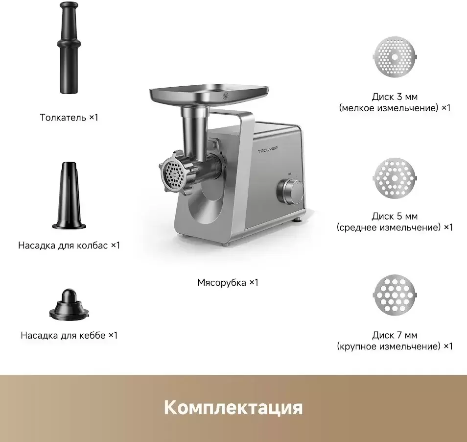 Информация о характеристиках, комплекте поставки и внешнем виде товара является справочной и получена из открытых источников (официальные сайты и каталоги производителей). Перед покупкой уточняйте у продавца интересующие Вас параметры и актуальную цену на Мясорубка Trouver Meat Grinder MG20.