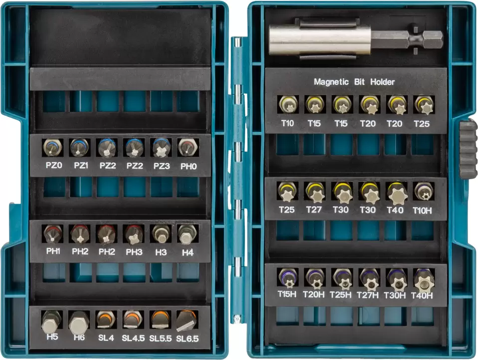 Набор бит и сверл состоящий из 62 предметов. В комплект входит: Cверла для бетона, металла и дерева в металлической коробке следующих размеров: 3, 4, 5, 6, 8, 10 мм; Шестерни длиной 25 мм в контейнере из ударопрочного пластика; Биты: PH0, PH1, PH2 x2, PH3; PZ0, PZ1, PZ2 x2, PZ3; SL4, SL4.5, SL5.5, SL6.5; T10, T15x2, T20x2, T25x2, T27, T30x2, T40; с отверстием: T10H, T15H, T20H, T25H, T27H, T30H, T40; H3, H4, H5, H6; Магнитные гнезда 1/4 с шестигранной головкой 8 x2, 10, 12, 13 мм; Магнитные держателя с длиной 60 мм и 30мм бит PH2 с крышкой.