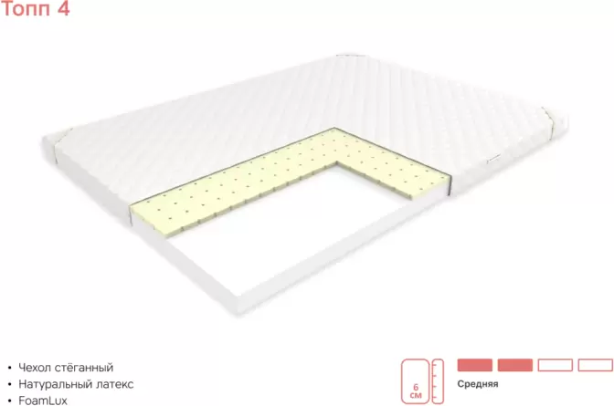 Наматрасник ортопедический EOS Топп 4 Наматрасник ортопедический не только повышает комфорт и ортопедические свойства вашего спального места, но и защищает матрас от повреждений, пятен и других загрязнений. Он позволяет изменить жесткость, сглаживает небольшие неровности, стыки и впадины. Такой наматрасник увеличивает комфорт спального места и обеспечит отличный отдых. Состав: · Съёмный чехол Бязь. Бязь (100% хлопок) — экологичная, гипоаллергенная, износостойкая ткань, отлично пропускает воздух, позволяет телу дышать. Стирка при t до 30°С. Качество подтверждено сертификатом EAC. · Натуральный латекс. Натуральный гипоаллергенный материал на основе сока гевеи. Благодаря своей эластичности и упругости способен выдерживать большое давление и восстанавливать свою первоначальную форму, что создает максимально комфортное спальное место. Материал обеспечивает оптимальный тепловой режим: прохладу летом и тепло зимой. · FoamLux. Современный, эластичный, гипоаллергенный материал. Благодаря ячеистой структуре, хорошо пропускает воздух. Уникальные свойства материала обеспечивают долгий срок эксплуатации матраса, его надёжность и качество. Сертификат соответствия качества CertiPUR свидетельствует о безопасности продукции и подтверждает, что в составе пены нет вредных химических веществ.