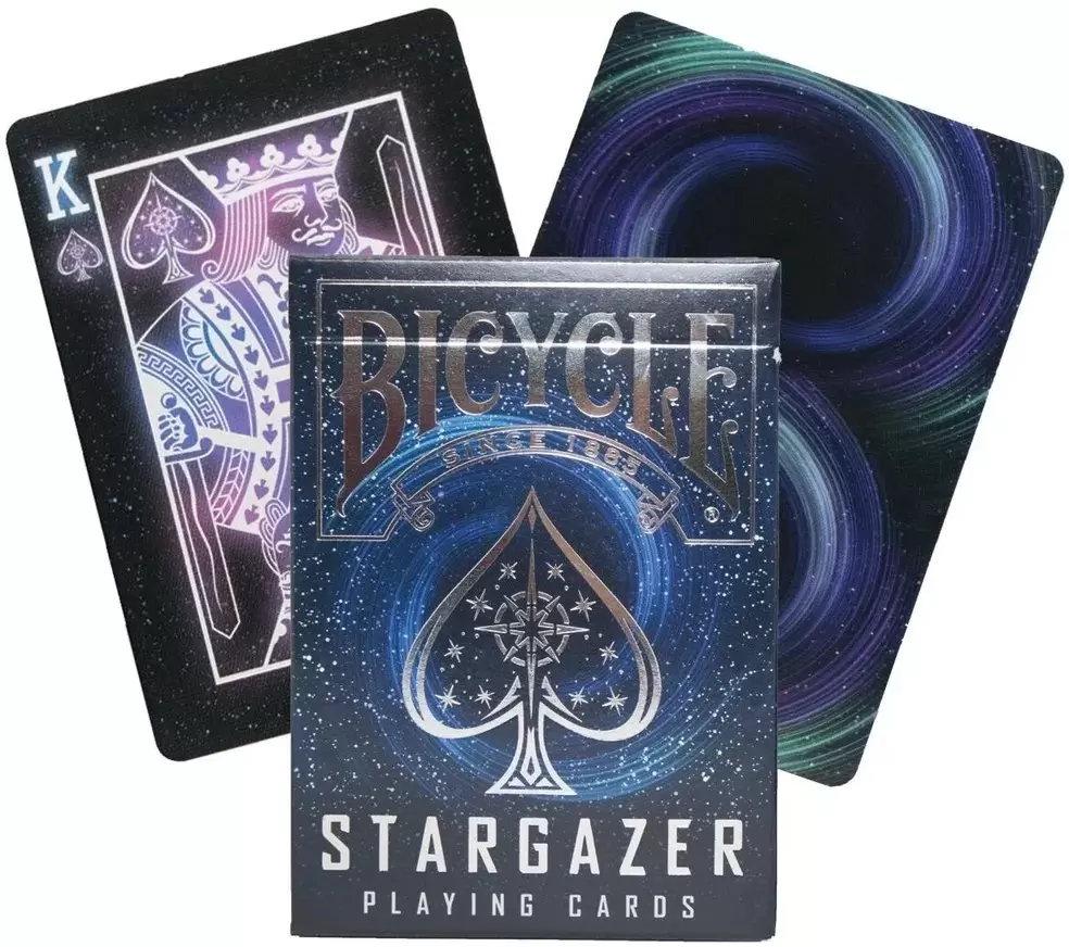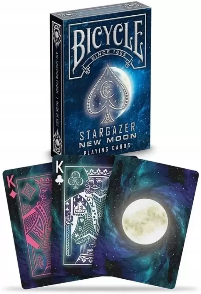 Игральные карты Stargazer New Moon — одна из самых оригинальных колод в ассортименте этого известного американского бренда. Тематика колоды посвящена космосу, благодаря чему она имеет соответствующее оформление. Кастомизированы под тематику даже индексы и масти, а в качестве главного украшения рубашки используется изображение луны. Коробочка в тематическом дизайне украшена сияющими вставками серебристой фольги.