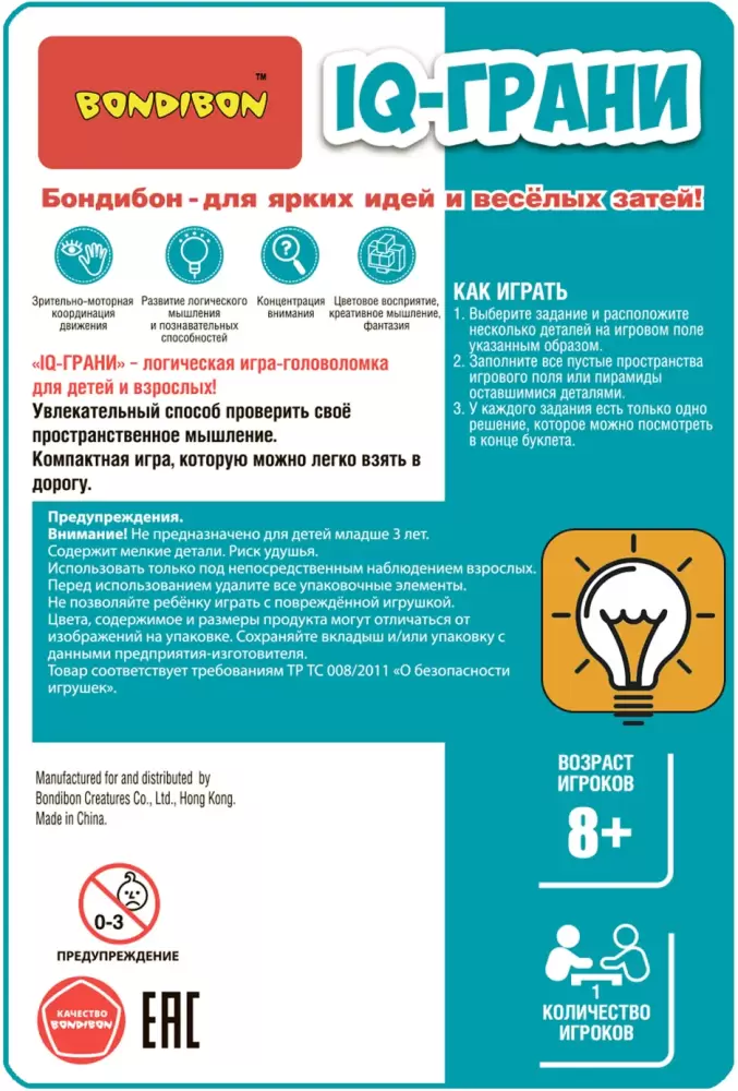 Информация о характеристиках, комплекте поставки и внешнем виде товара является справочной и получена из открытых источников (официальные сайты и каталоги производителей). Перед покупкой уточняйте у продавца интересующие Вас параметры и актуальную цену на Настольная игра Bondibon БондиЛогика IQ-Грани ВВ5953.