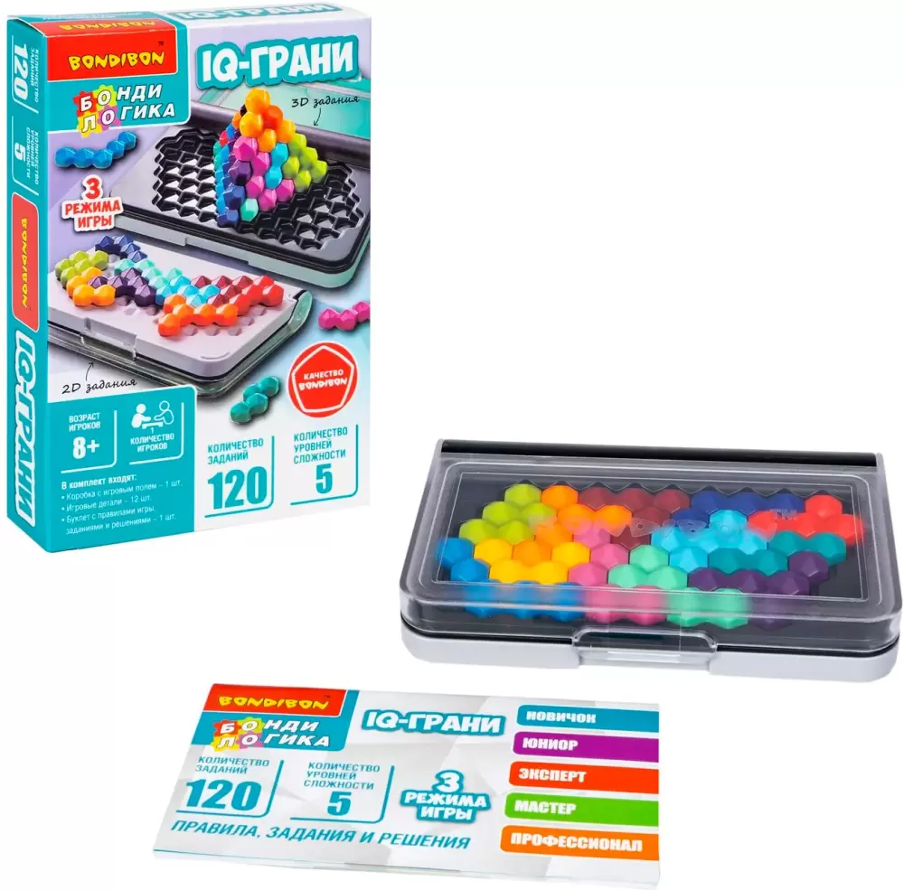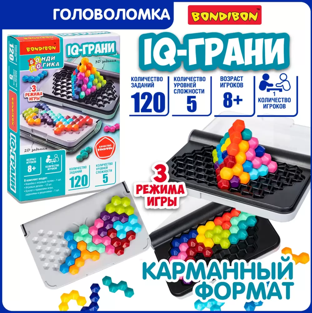 Настольная игра IQ Грани от Bondibon - это отличное решение для увлекательного досуга детей и взрослых. Эта прикольная логическая головоломка станет полезным подарком для мальчика и девочки, помогая развивать интеллект, стратегическое мышление и усидчивость. Такой нейротренажер отвлекает от гаджетов, стимулирует логику, улучшает концентрацию внимания. ра для путешествий со 120 заданиями разных уровней сложности. Вы можете настроить сложность логической игры от начального до основного, шаг за шагом тренируя мозг.