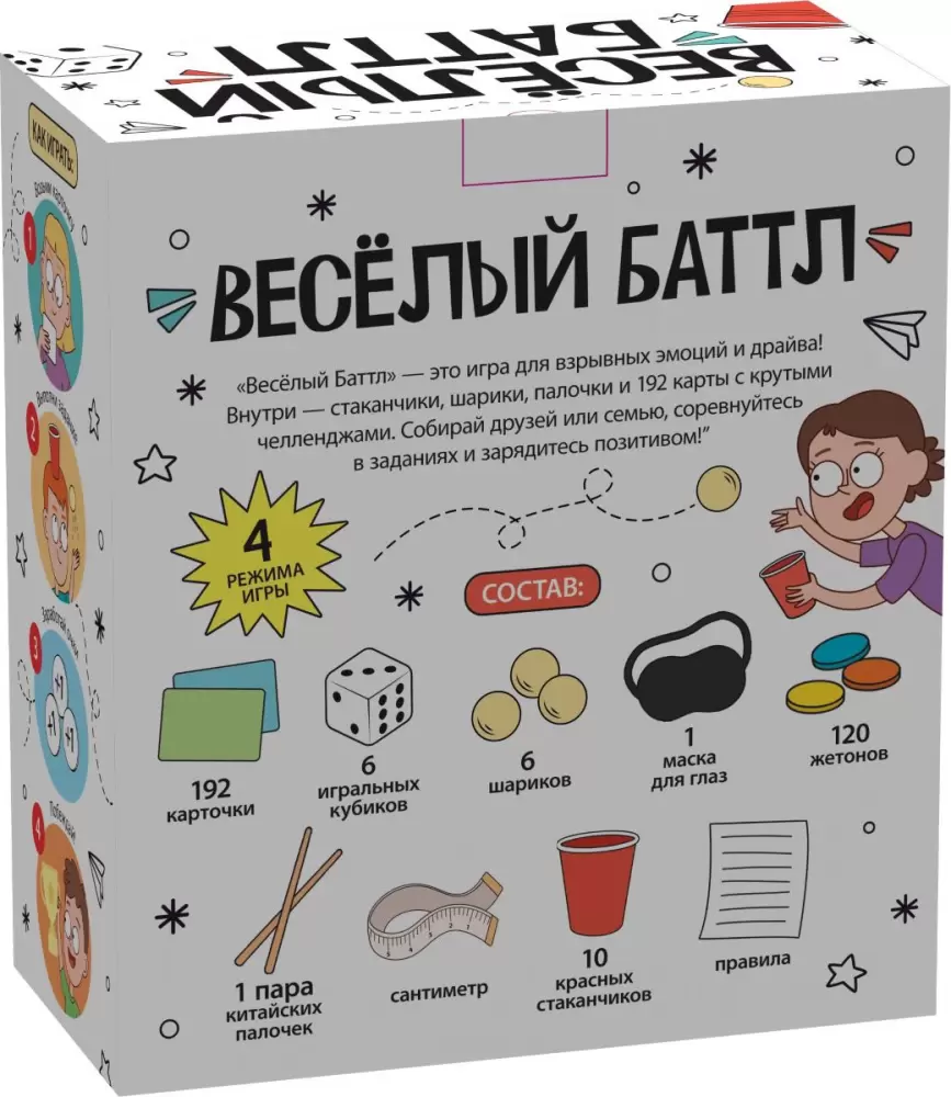Готовы к безумным челленджам с настольной игрой «Весёлый баттл»!? Это игра для взрывных эмоций и драйва. Простые правила, интересные задания, заставят вас проявить смекалку и ловкость. Собирай друзей или семью, тяните карточки и соревнуйтесь за титул короля вечера. Это развлечение, наполнит смехом любой вечер.