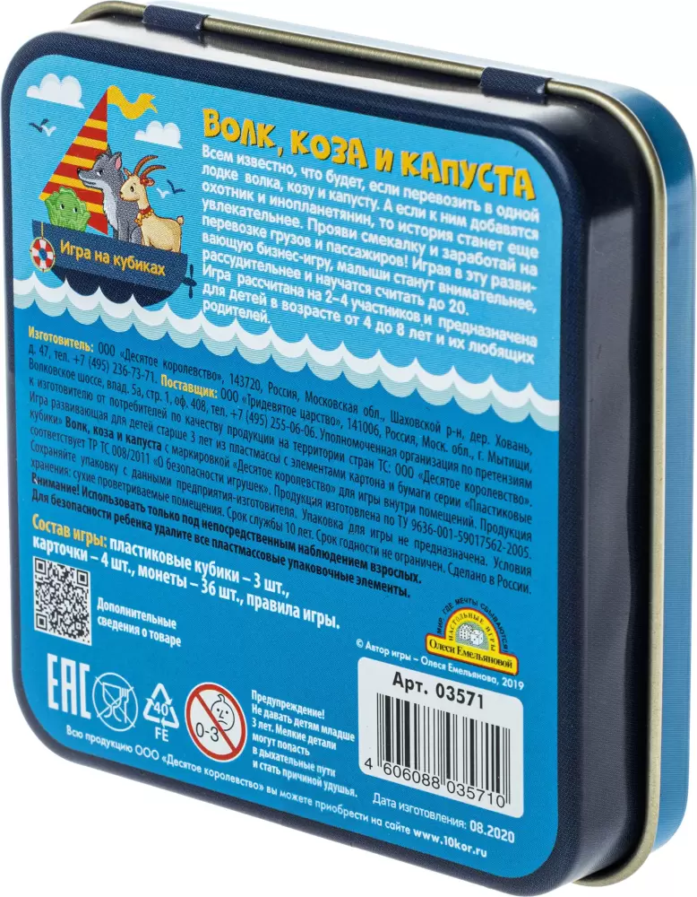 Информация о характеристиках, комплекте поставки и внешнем виде товара является справочной и получена из открытых источников (официальные сайты и каталоги производителей). Перед покупкой уточняйте у продавца интересующие Вас параметры и актуальную цену на Настольная игра Десятое королевство Волк коза и капуста 03571 жестяная коробочка.