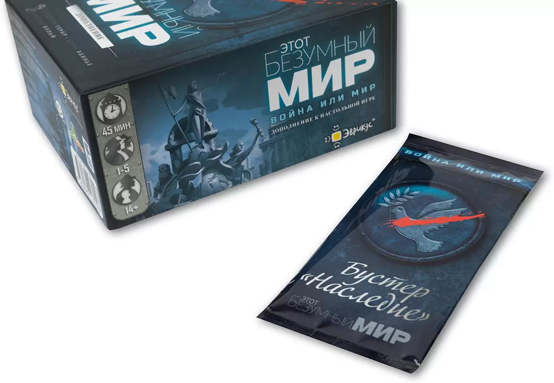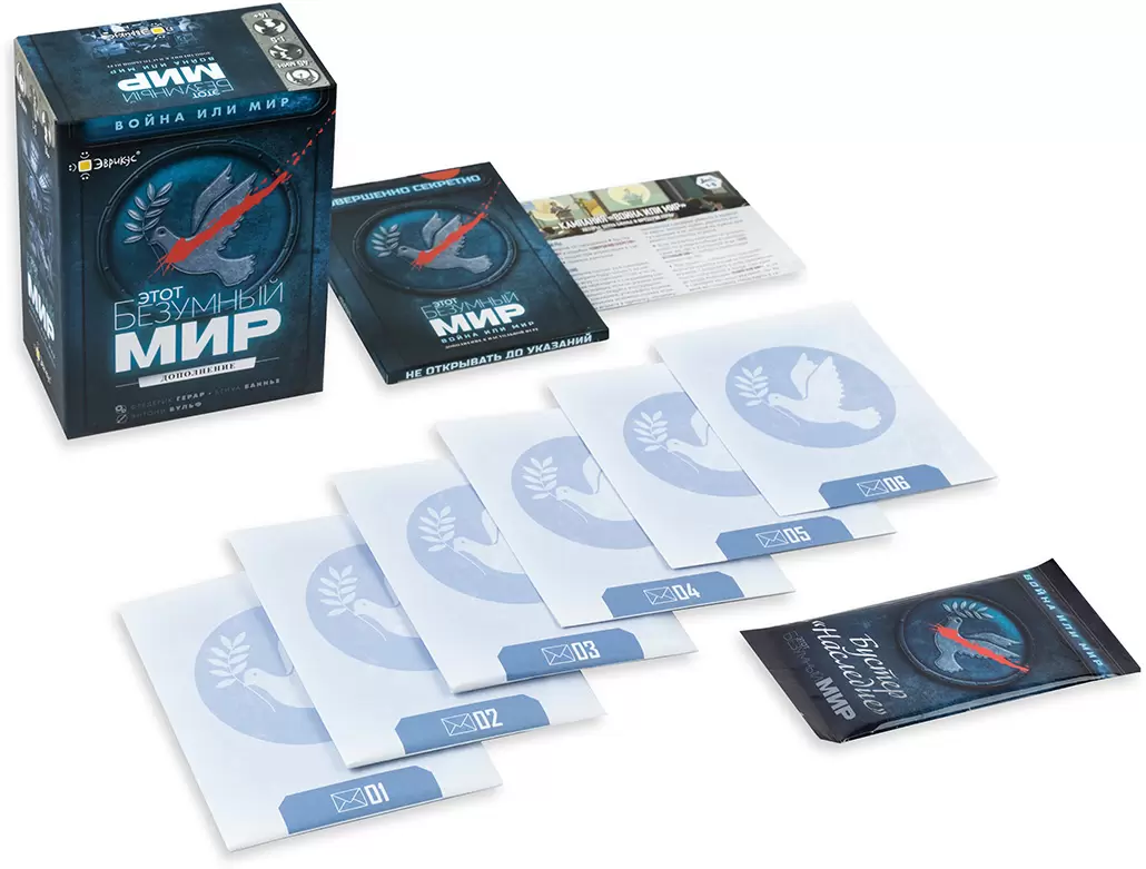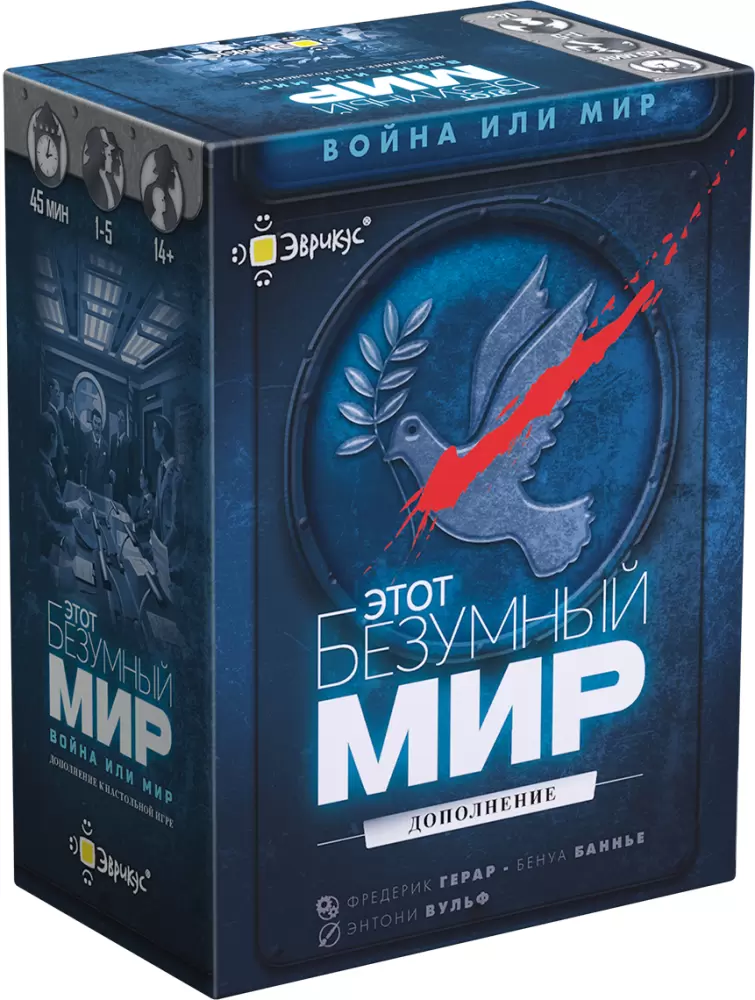 «Этот Безумный Мир: Война или Мир» — первое сюжетное дополнение к игре «Этот безумный мир». Это большая кампания из 6 связанных сценариев, в которой ваши успехи и решения приведут империи к войне или миру! Дополнение превносит в основную игру новые механики, сюжеты и дополнительные карты. Дополнение – это единая кампания, в ходе которой игроки разыграют 5 сценариев.