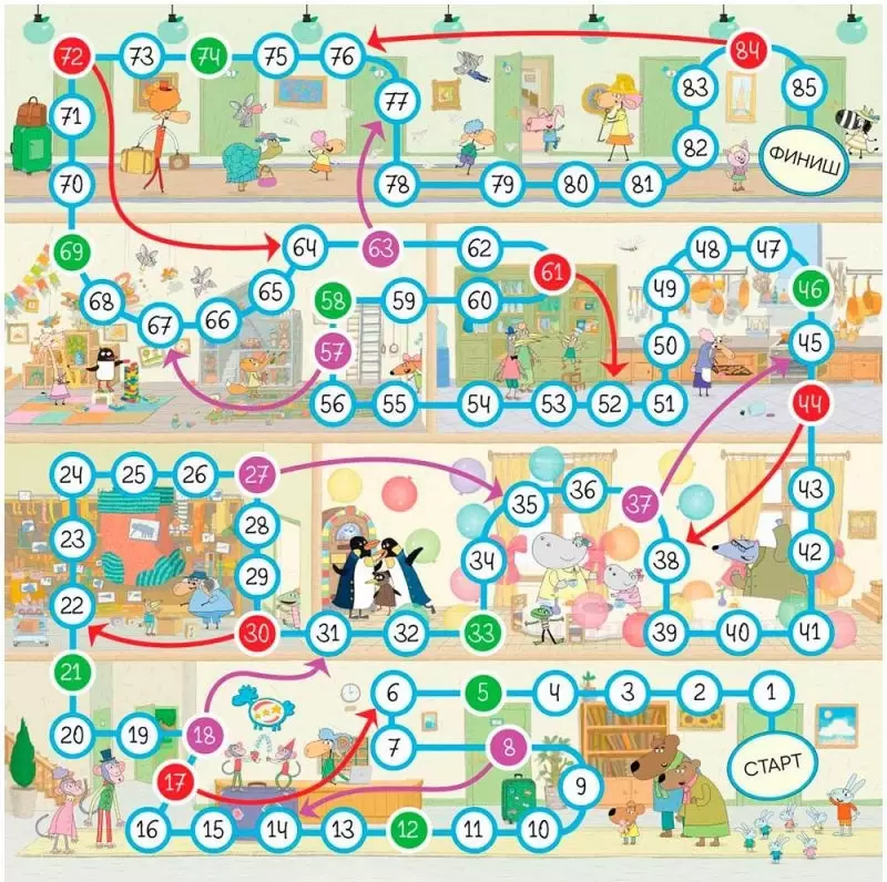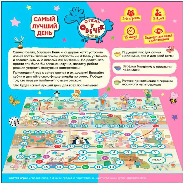 Овечка Белла, барашек Беня и их друзья хотят устроить новым гостям тёплый приём, показать им «Отель у Овечек» и познакомить их с остальными жителями. Но делать это просто так было бы слишком скучно, поэтому ребята решили устроить экскурсию наперегонки. Присоединяйтесь к семье овечек и их друзьям. Бросайте кубик и двигайте свою фишку вперёд по отелю. Победит тот, кто первым пробежит по всем этажам. Это будет самый лучший день для всех постояльцев.
