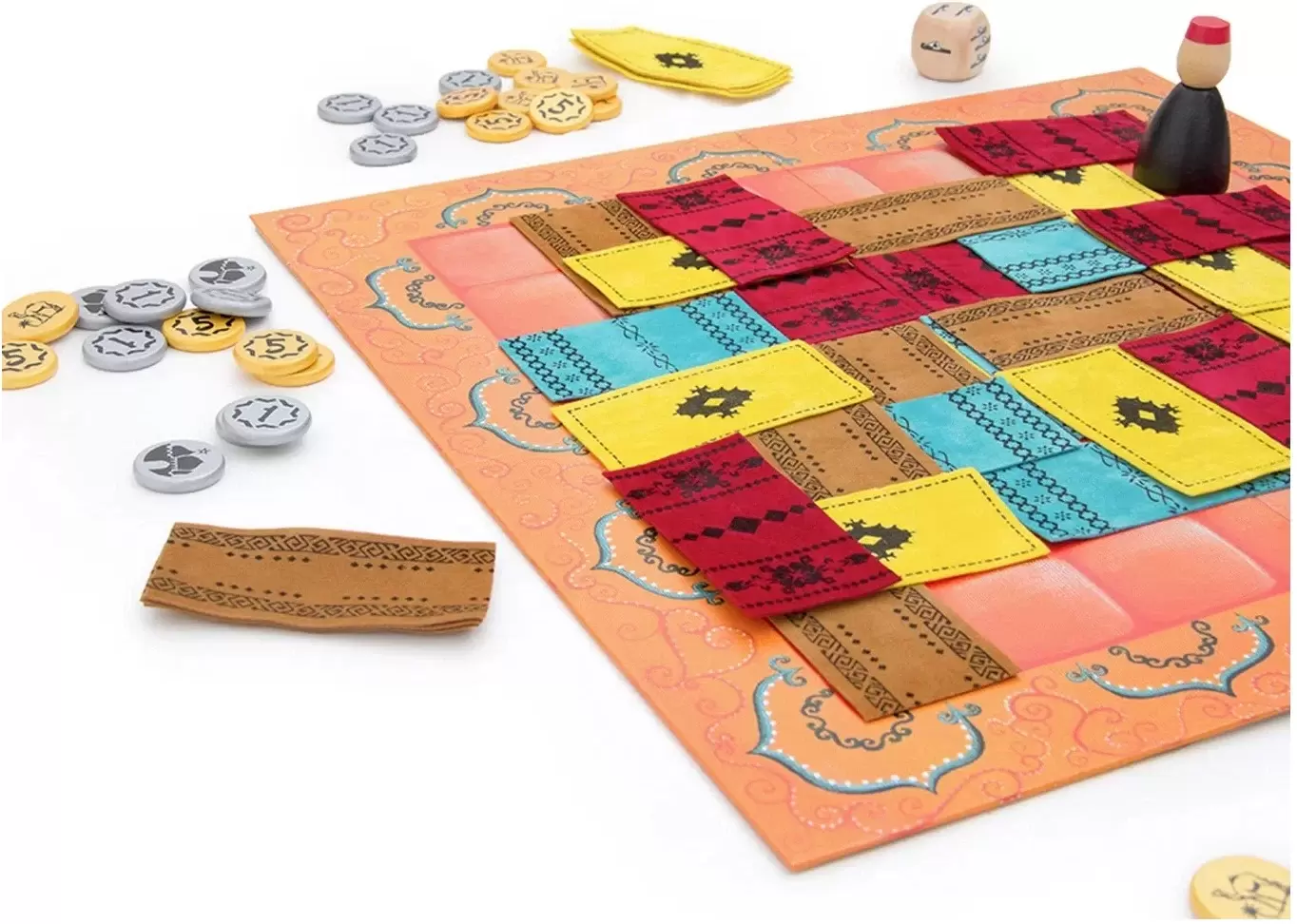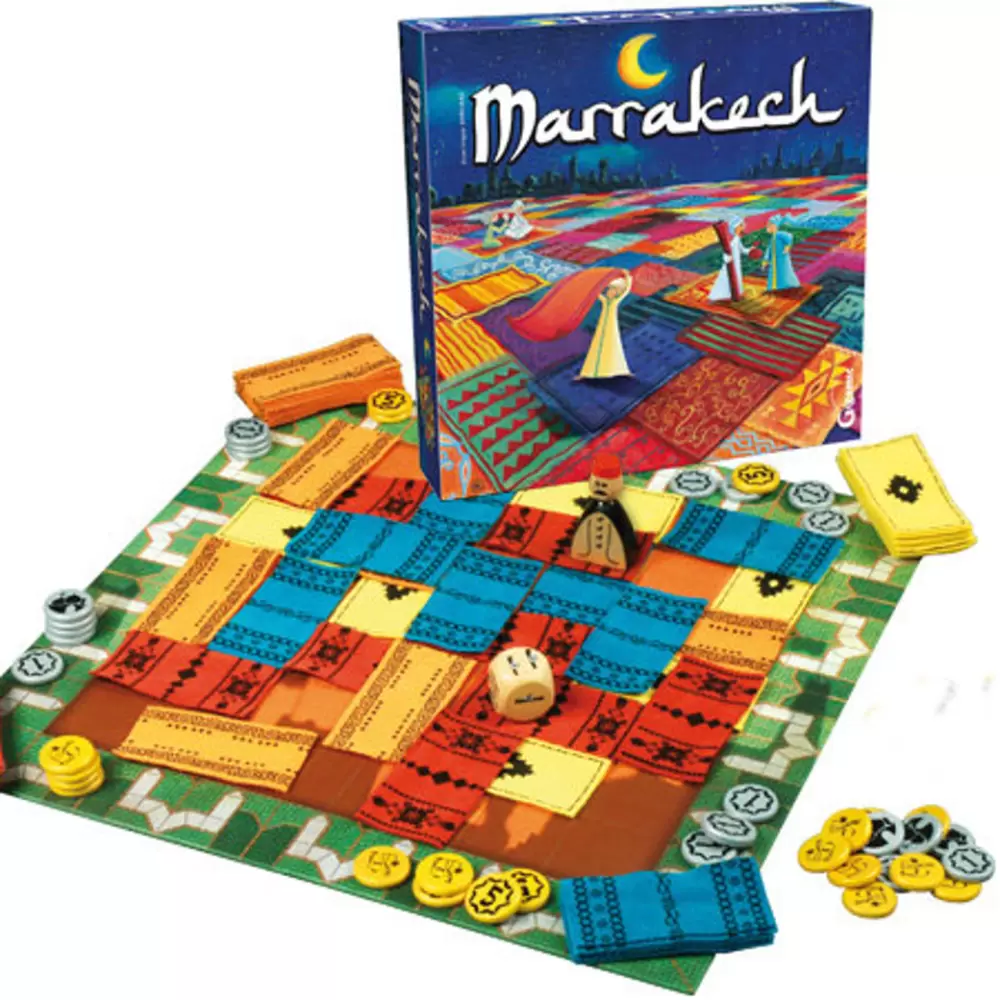 Ковровый рынок Марракеш бурлит: вот-вот будет объявлен лучший продавец. Каждый игрок стремится добиться того, чтобы в конце игры было видно максимальное количество его ковров, и в то же самое время старается получить наибольшую прибыль. По окончании игры побеждает самый состоятельный игрок (это определяется суммированием видимых ковров игрока и его накопленных денег).В составе настольной игры Марракеш: рыночная площадь, 57 матерчатых ковров, 40 монет, Ассам – хозяин рынка.
