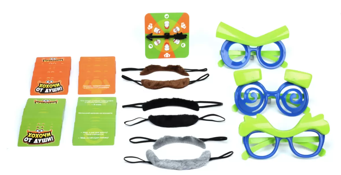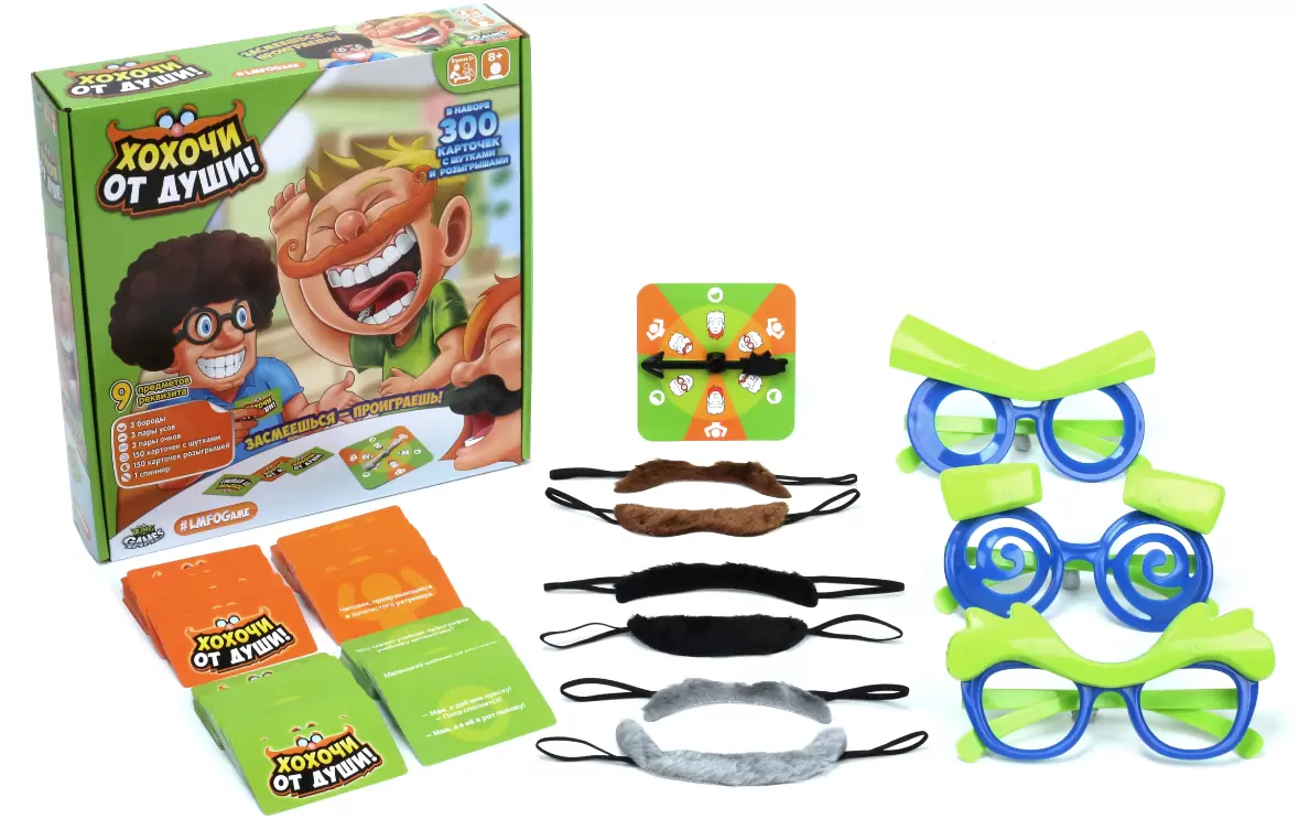 «Хохочи от души» - новинка от создателя мировых бестселлеров Zing! Проверьте себя и посмотрите, сможете ли вы удержать серьезное лицо. Это игра, где проигрывает тот, кто засмеется. Заставьте смеяться своих друзей, рассказывая анекдоты, пародируя и разыгрывая смешные ситуации, используя нелепые парики и реквизит.