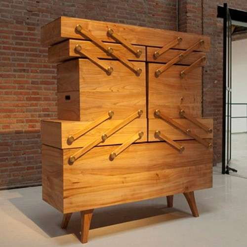 Кики ванн Эйк работает с самыми различными техниками: в ее последней коллекции можно найти и коллекцию ламп, и часы, и шкафчики из гнутой проволоки, и огородное чучело. Однако настоящее сердце коллекции – это шкаф, который был сконструирован по принципу старинной шкатулки для рукоделия. Главное в нем – механизм, на создание которого у дизайнера ушло почти три года. Результатом усердного труда стал уникальный функционал шкафа – он раздвигается и превращается в набор отдельных ящичков, а потом легким движением руки захлопывается.
