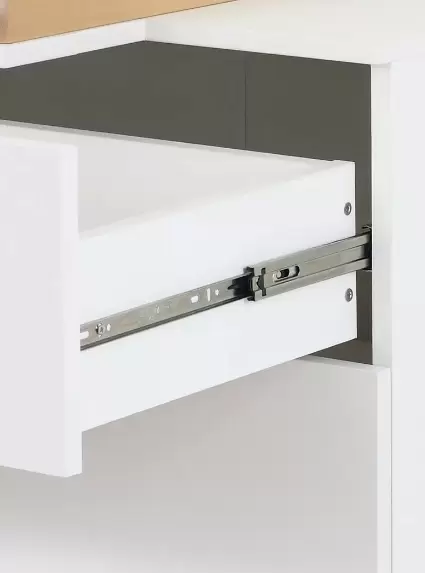 Во-первых, пяти миллиметровые зазоры между ящиками. Сперва подумал, что собрал криво (хотя всё по разметке), но потом посмотрел на фото продавцов, там такие же щели. Особенно хорошо это видно на розовых и голубых фасадах из МДФ. Этот недостаток устранил, перевесив роликовые направляющие. Но "осадок" остался.