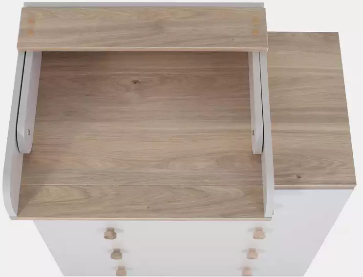 Столик поднимается за спец. хлястик (фото № 6) и надежно фиксируется. Механизм безопасности не даёт пеленальной полочке случайно упасть на голову ребёнка