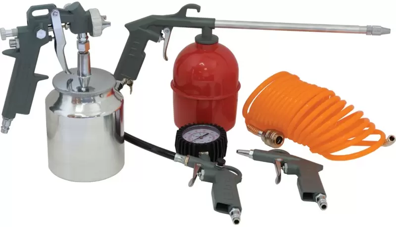 Набор пневмоинструмента для компрессоров из 5 предметов: краскопульт, насадка для подкачки шин, шланг 5 м, насадка для распыления воды, насадка для работы сж. воздухом.