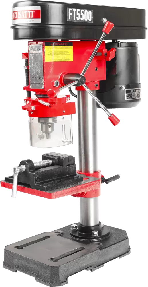 Настольный сверлильный станок FT5500 Felisatti СС-13/350Э идеальное решение для бытового использования и профессиональной работы с небольшими и средними диаметрами сверления. Компактный, надежный и удобный в эксплуатации, этот станок обеспечит высокую точность и комфорт при сверлении различных материалов. FELISATTI СС-13/350Э надежный и удобный настольный сверлильный станок, который станет незаменимым помощником в домашней мастерской и при выполнении профессиональных задач. Преимущества : Надежная и простая конструкция с качественными комплектующими обеспечивает стабильную и точную работу. Мощный асинхронный двигатель 350 Вт с режимом S1 гарантирует длительную работу без перегрева, даже при продолжительных нагрузочных циклах. Ременная передача с двухступенчатым пятиручейковым шкивом позволяет легко менять скорость вращения шпинделя и подбирать оптимальный режим работы. 5 ступеней частоты вращения шпинделя от 620 до 2620 об/мин обеспечивают универсальность для сверления различных материалов и диаметров. Пиноль шпинделя с резьбовым упором-ограничителем позволяет точно контролировать глубину сверления с помощью штангенциркуля или по оборотам гайки. Регулируемый чугунный стол с возможностью наклона и поворота вокруг горизонтальной оси для удобства обработки заготовок под разными углами. Станочные тиски Wilton и ключевой патрон с конусом Морзе в комплекте обеспечивают надежное крепление инструмента и заготовки. Шпиндель на шарикоподшипниках повышает точность и долговечность работы. Литая станина обеспечивает устойчивость и минимальные вибрации при работе. Складная защита от стружки повышает безопасность оператора. Ременная передача: - Плавность и меньше вибраций - Долговечность механизма Асинхронный двигатель: - Высокая надежность и долговечность - Тихая работа и низкий уровень вибрации Регулируемая частота вращения: - Оптимальный режим для разных материалов - Универсальность и точность