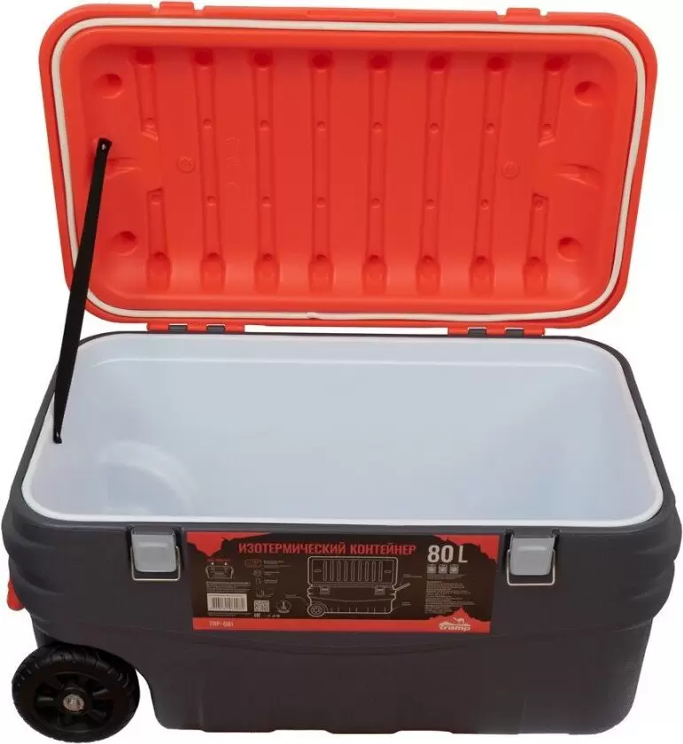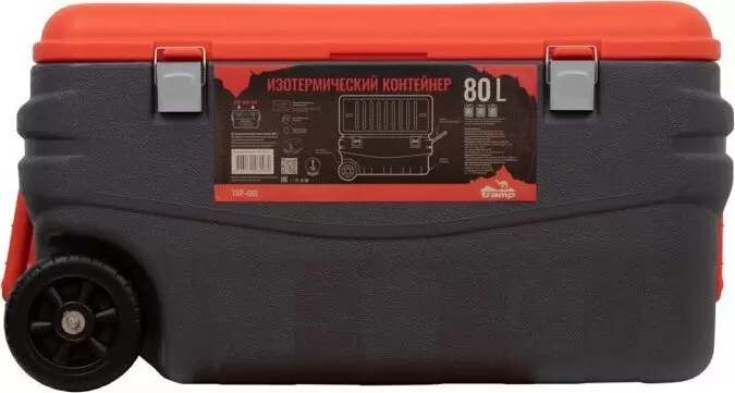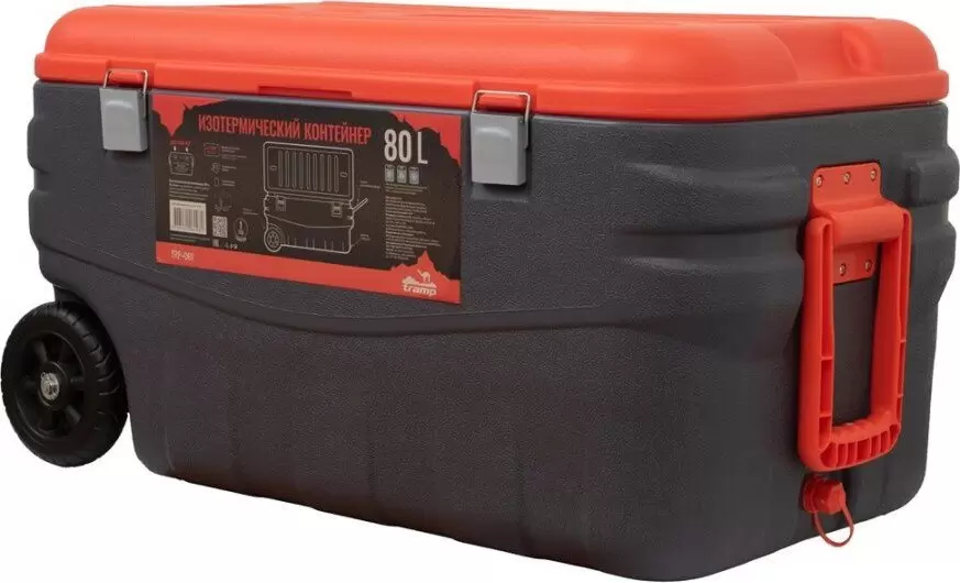Термобокс Tramp на 80 л предназначен для сохранения нужной температуры продуктов и напитков. Также подходит для перевозки рыбы и дичи. Герметично закрывается – из контейнера ничего не прольётся и вас не будут беспокоить запахи. Ударопрочный корпус из высокопрочного HDPE — полиэтилена высокой плотности. Легко моется — внутренние стенки из полистирола без проблем отмываются губкой. Сохраняет температуру 150 часов! Отличное решение для кемпинга и рыбалки – вы можете наслаждаться холодными напитками все выходные. Рекомендуем использовать вместе с аккумуляторами холода из расчёта 10% от объёма контейнера. Два колеса снизу для удобной транспортировки. Можно сидеть — корпус выдерживает нагрузку до 100 кг. Сливной клапан